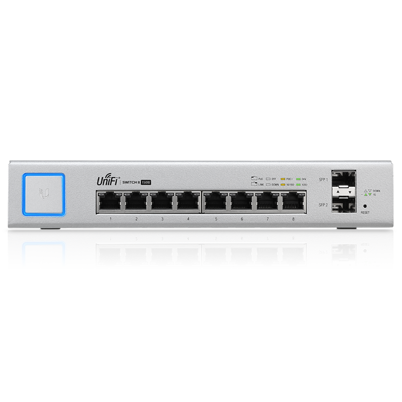 Expand and power your network with the UniFi Switch 8 150W, part of the Ubiquiti Networks UniFi Enterprise System. The UniFi Switch 8 150W is a fully managed PoE+ Gigabit switch, delivering robust performance and intelligent switching for enterprise networks. The UniFi Switch 8 150W offers the flexibility of (8) Gigabit RJ45 ports with auto-sensing PoE+ or 24V Passive PoE to power your UniFi access points and other PoE devices. Additionally, two SFP ports provide uplink and fiber connectivity options capable of delivering speeds of up to 1 Gbps each. The UniFi Switch 8 150W supports up to 10 Gbps total, non-blocking line rate.